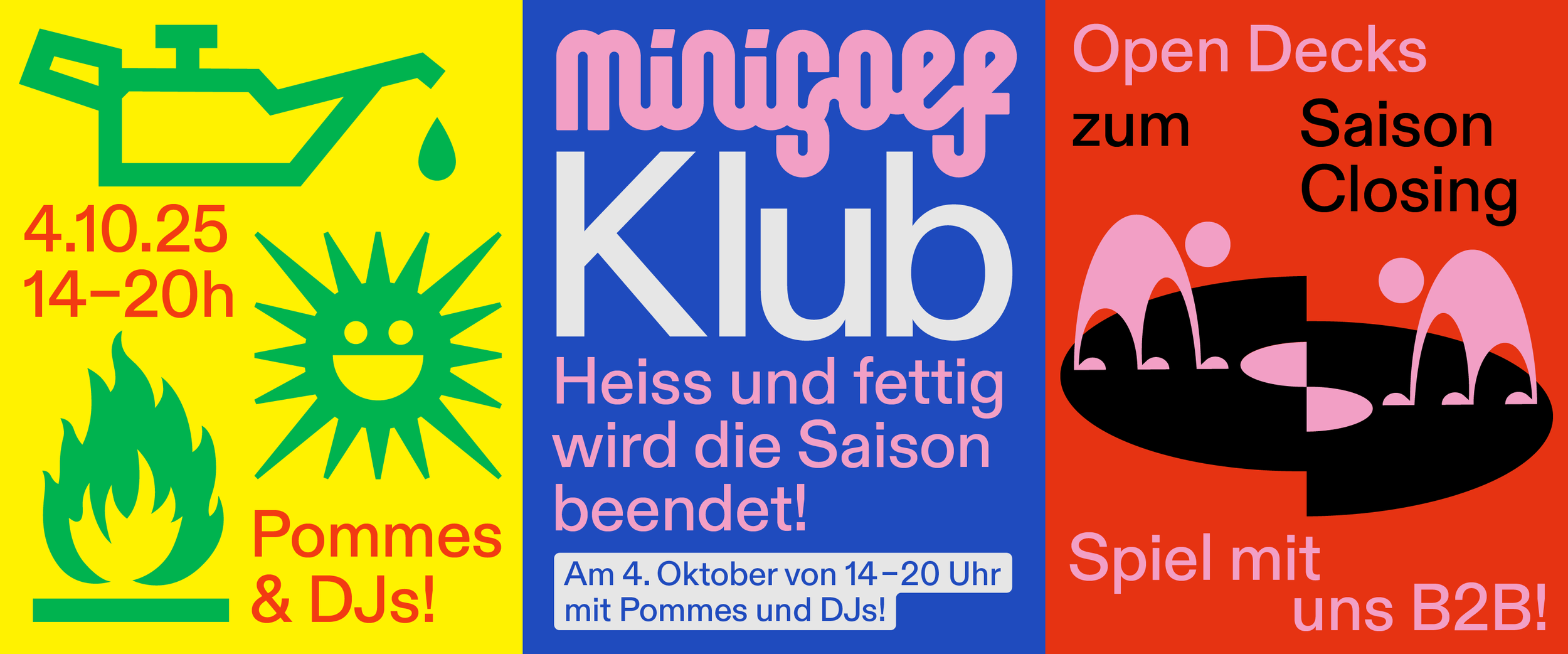 freund:innen der sonne aufgepasst: nächsten samstag zelebrieren wir die vielen feste, freuden und high-scores dieser saison in wohl bekannter minigolf-manier, nämlich heiss und fettig. wir verabschieden den sommer und unseren klub in den wohl verdienten winterschlaf und sagen bye bye saison 2025. das minigolfteam präsentiert sich b2b an den decks und fordert alle diskohäschen heraus sich ihnen anzuschliessen. also sticks einpacken und antanzen bitte, danke! weil wir freuen uns auf euch und eine volle ladung klöb-love <3